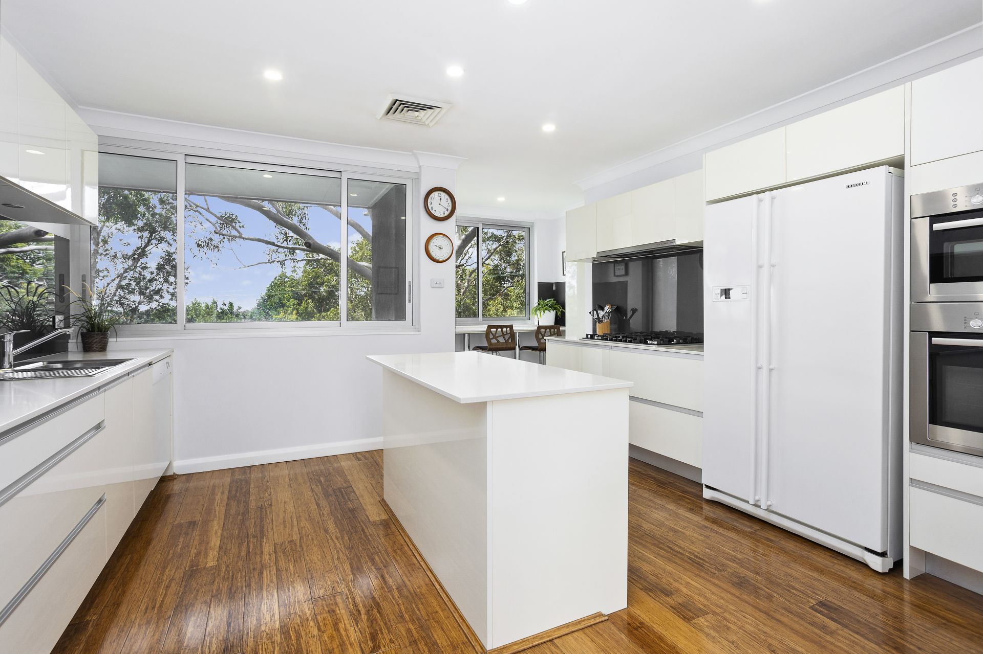 - Caesarstone kitchen equipped with quality appliances, 900mm gas cooktop, island bench & study nook