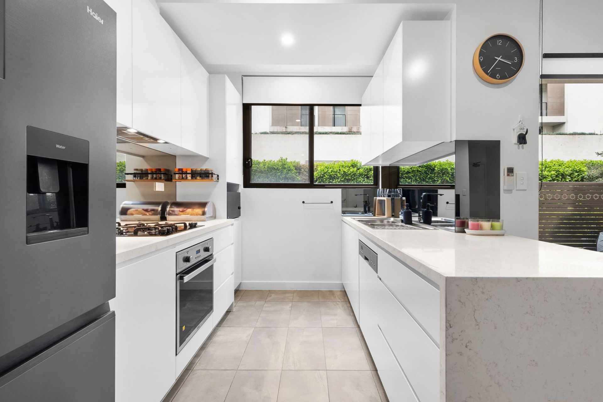 - Kitchen has oversized Caesar Stone benches, gas cooktop and dishwasher