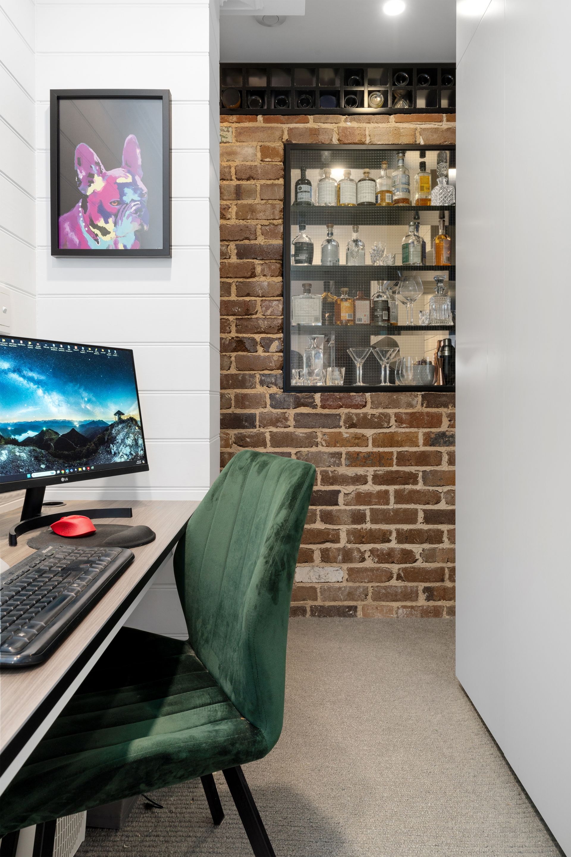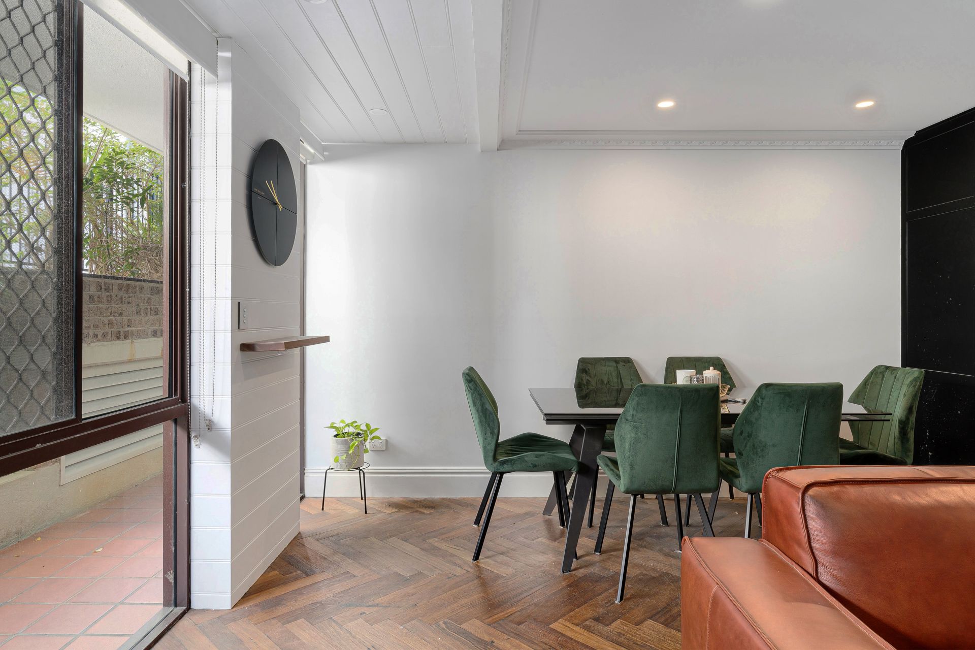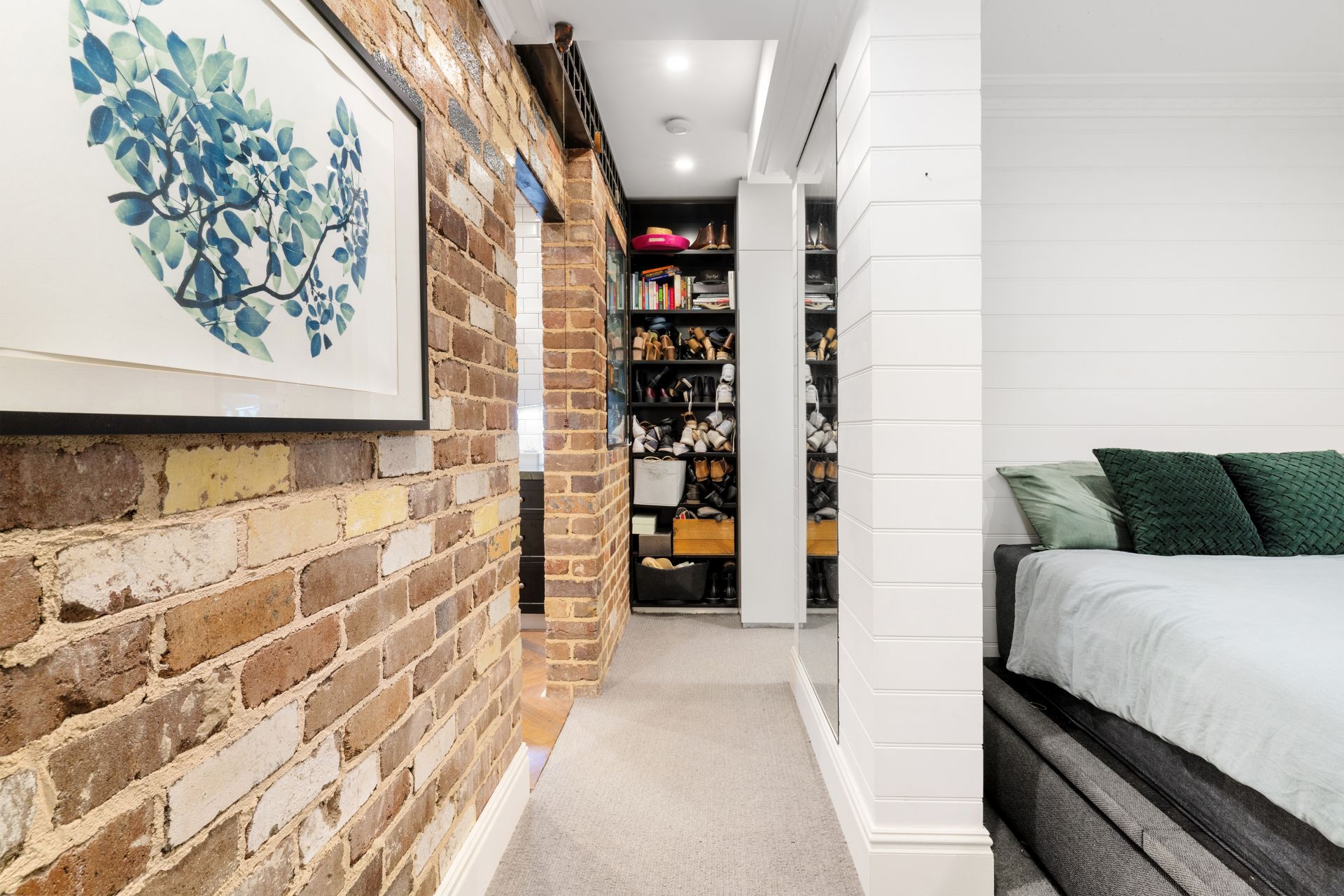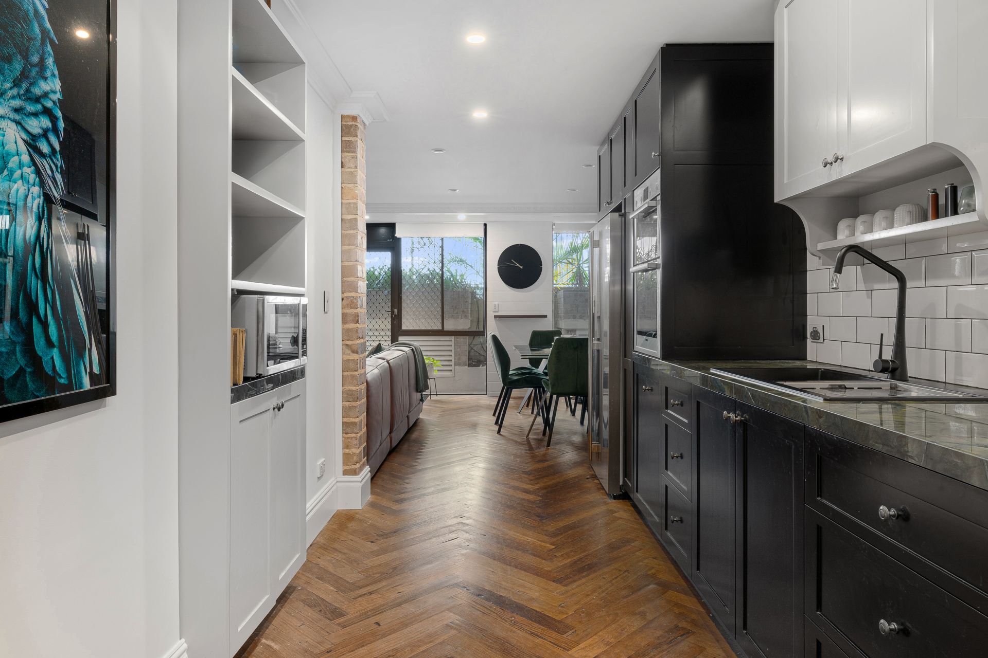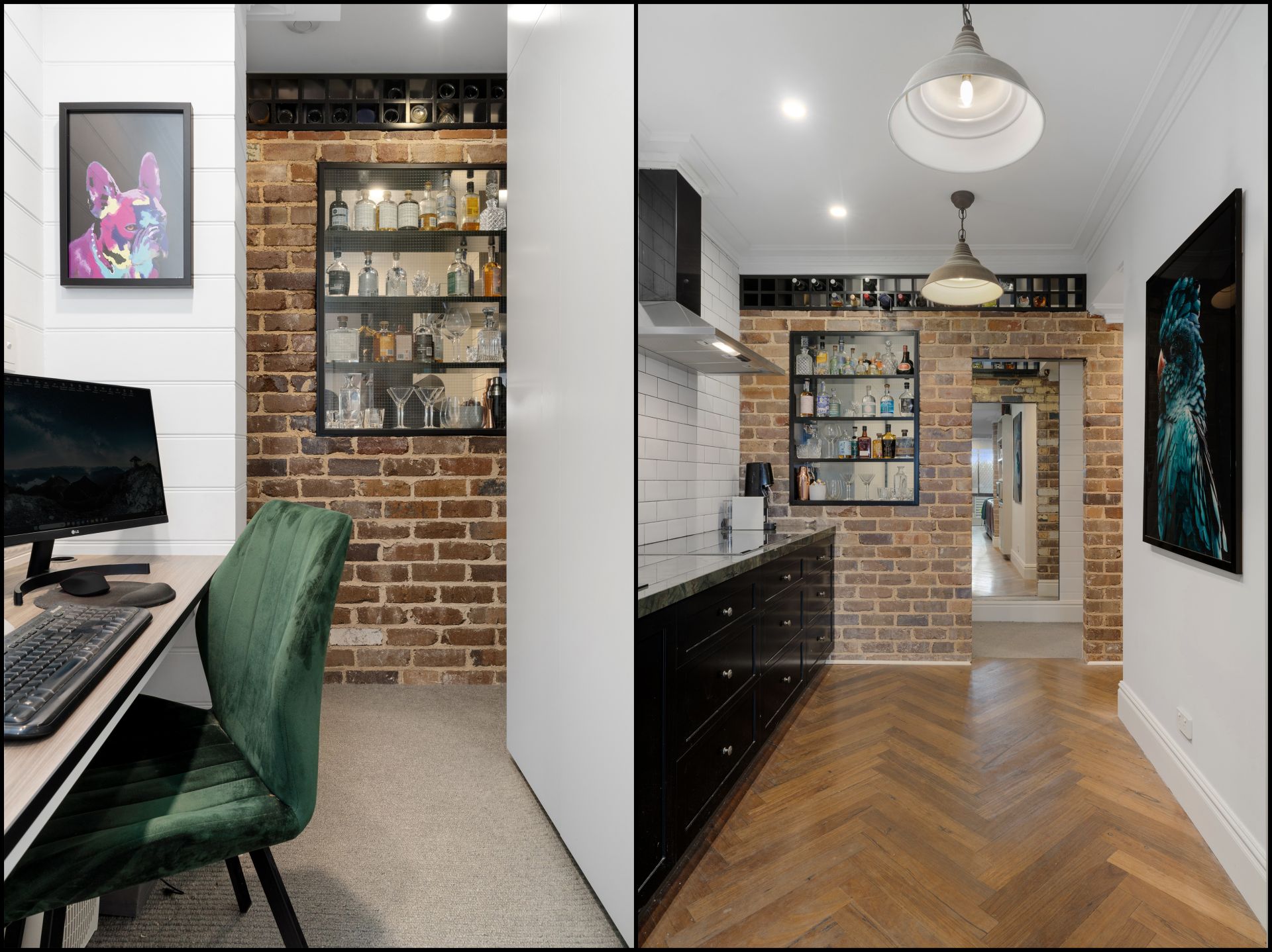 - Herringbone timber flooring and exposed brickwork throughout
