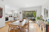 Inside, the open-plan living space is bathed in natural light, with bi-fold doors creating a seamless connection to the courtyard. The renovated kitchen is a standout, featuring stainless steel appliances and a gas cook top. Three generous bedrooms, all with built-in robes, and two upstairs opening to Juliette balconies. Both bathrooms are tastefully appointed, the main with a separate bath and shower.