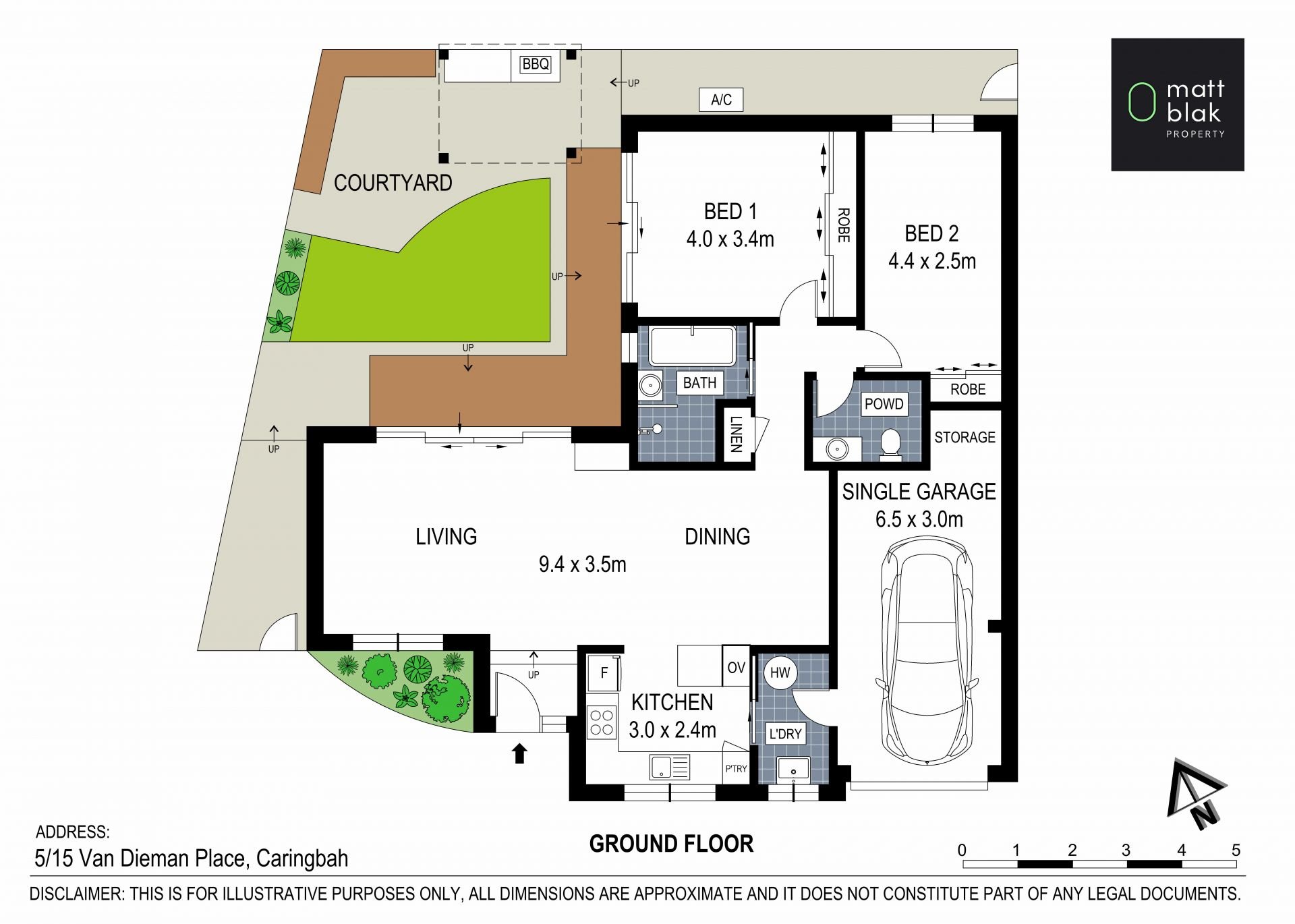 - Two generous bedrooms, both with built in robes, main with access to courtyard
