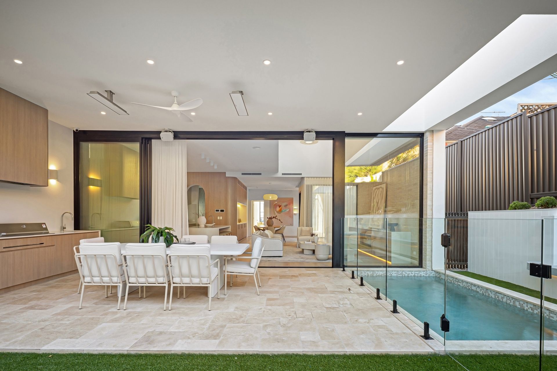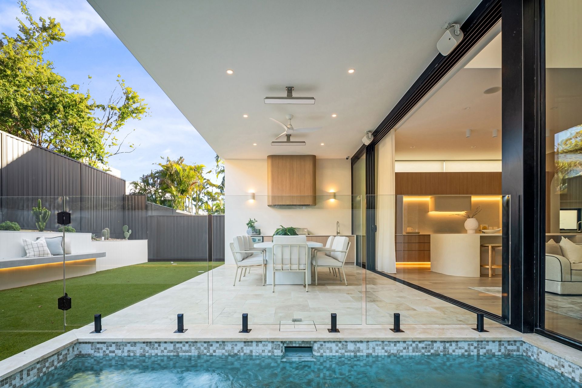 - The living area features a gas fireplace framed by custom brickwork. Surrounded by an internal atrium courtyard on one side and pool views on the other, flowing seamlessly to a covered alfresco with a built-in BBQ , designer rangehood, bromic heaters, outdoor sound system and outdoor bar fridge