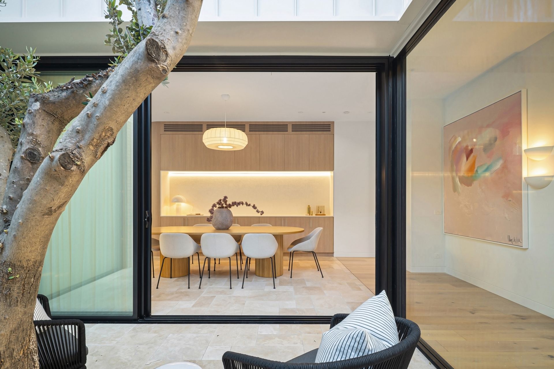 - The dining area is more than a place to share meals - it's an experience, thoughtfully positioned to embrace the home's architectural elements and natural light, travertine flooring connecting the space to the outdoor central courtyard