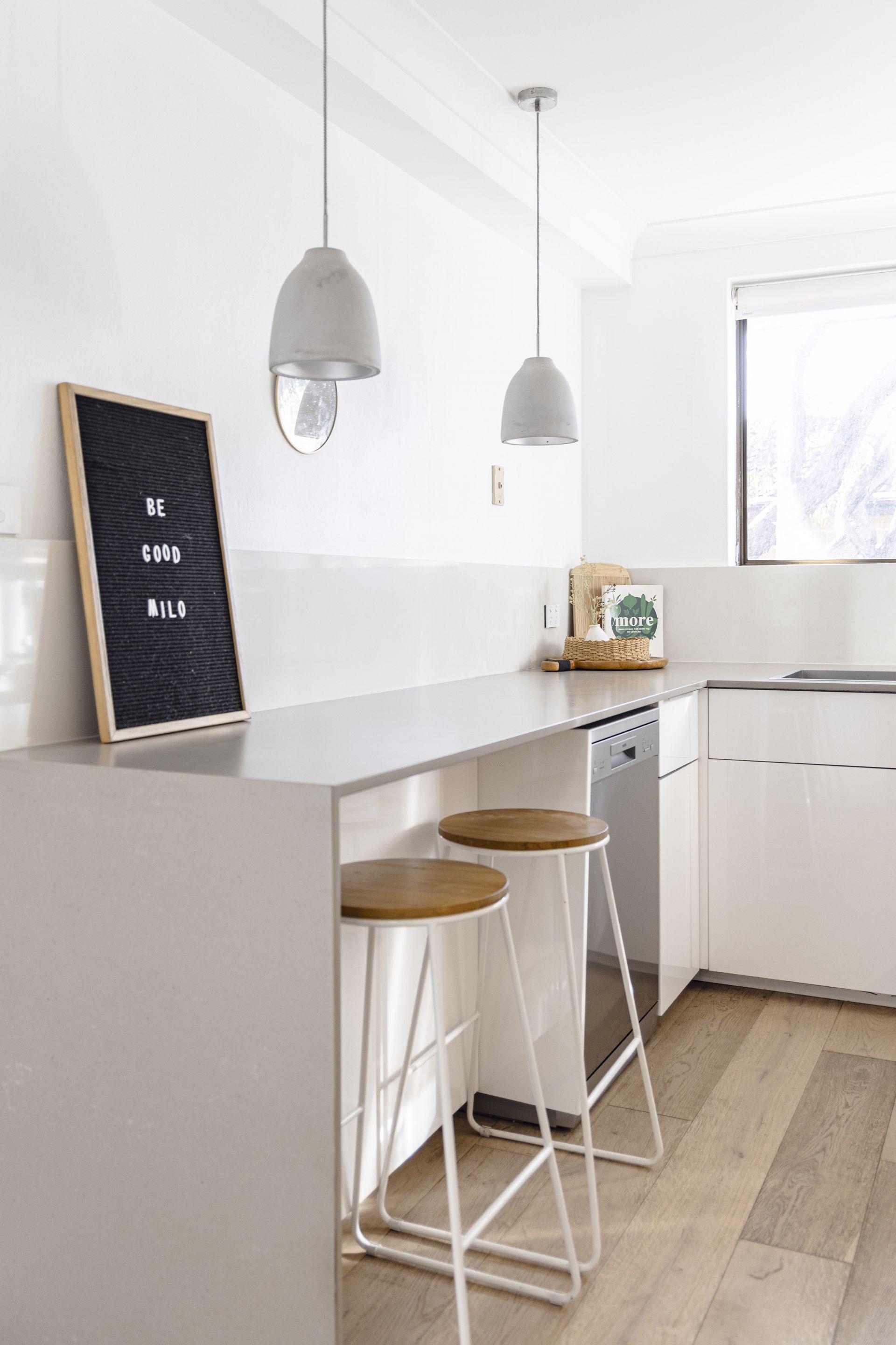 - Modern minimalist kitchen with stone benchtops, breakfast bar and induction cooktop