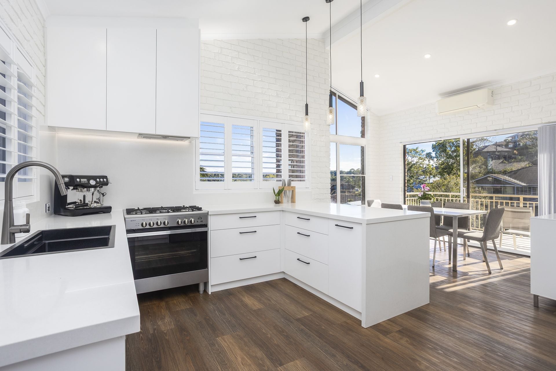 - Gourmet kitchen with gas cooktop, 90cm oven, stone benchtop and ample storage with an outlook over the pool and flowing to the front balcony