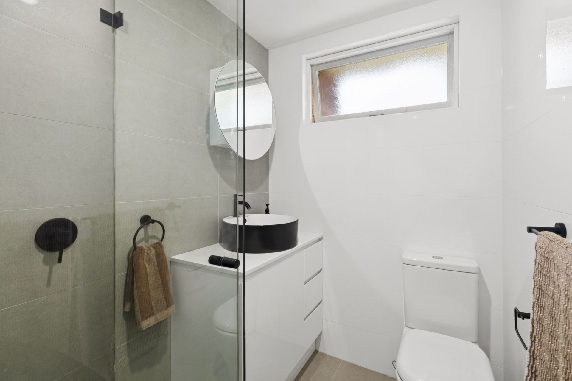 - Renovated bathroom featuring floor-to-ceiling tiles and quality finishes