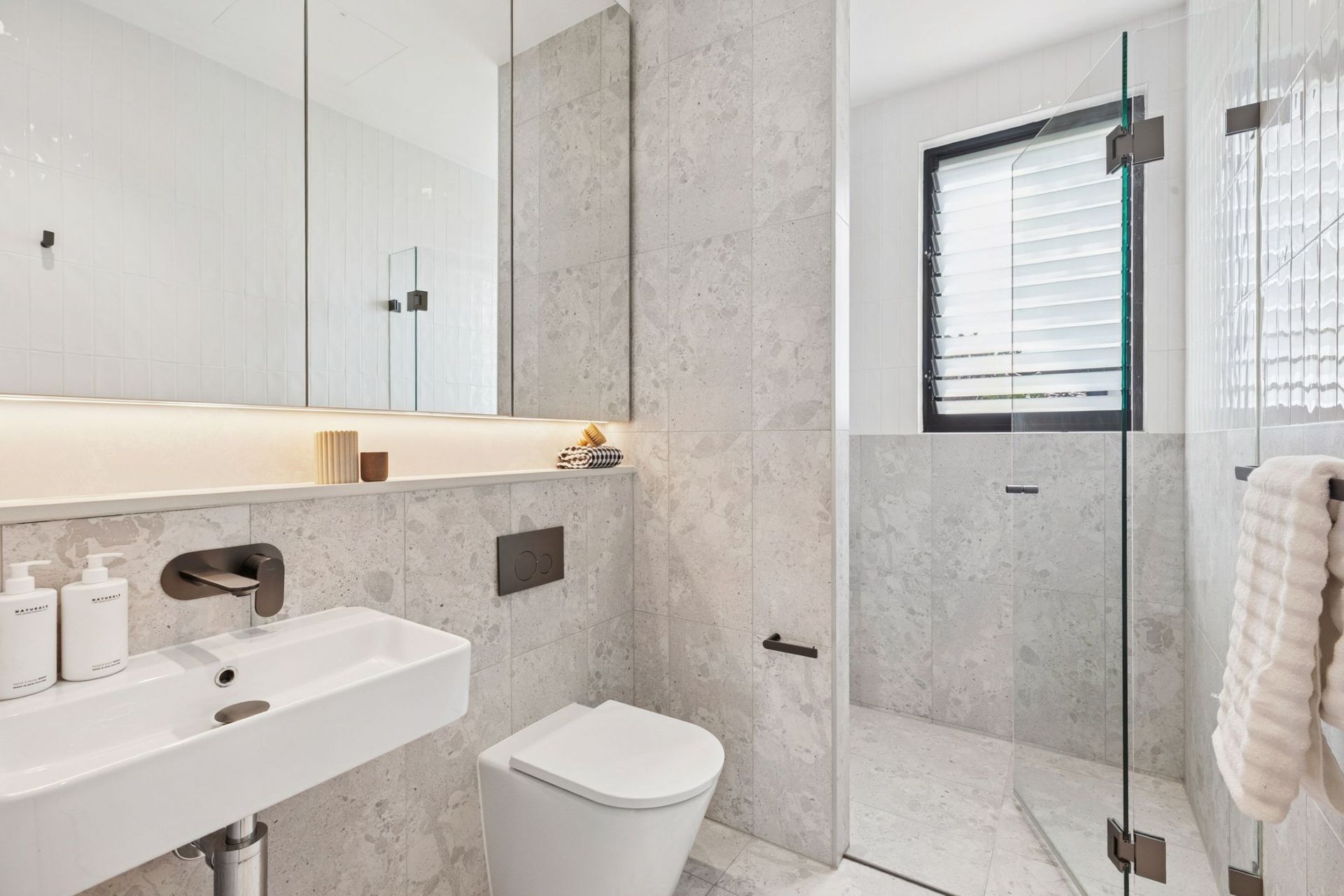 Privately freestanding at the rear of a boutique complex of six, the home showcases light-filled open-plan living flowing to a sunny courtyard, perfect for entertaining. The sleek kitchen includes stone benchtops, quality appliances, and ample storage, complemented by timber flooring and a soft neutral palette. A ground-floor bedroom and full bathroom provide flexibility, while upstairs two generous bedrooms each feature their own ensuite. Complete with a double garage and a prime location near Westfield, cafes, and public transport, this home delivers style, privacy, and everyday convenience.