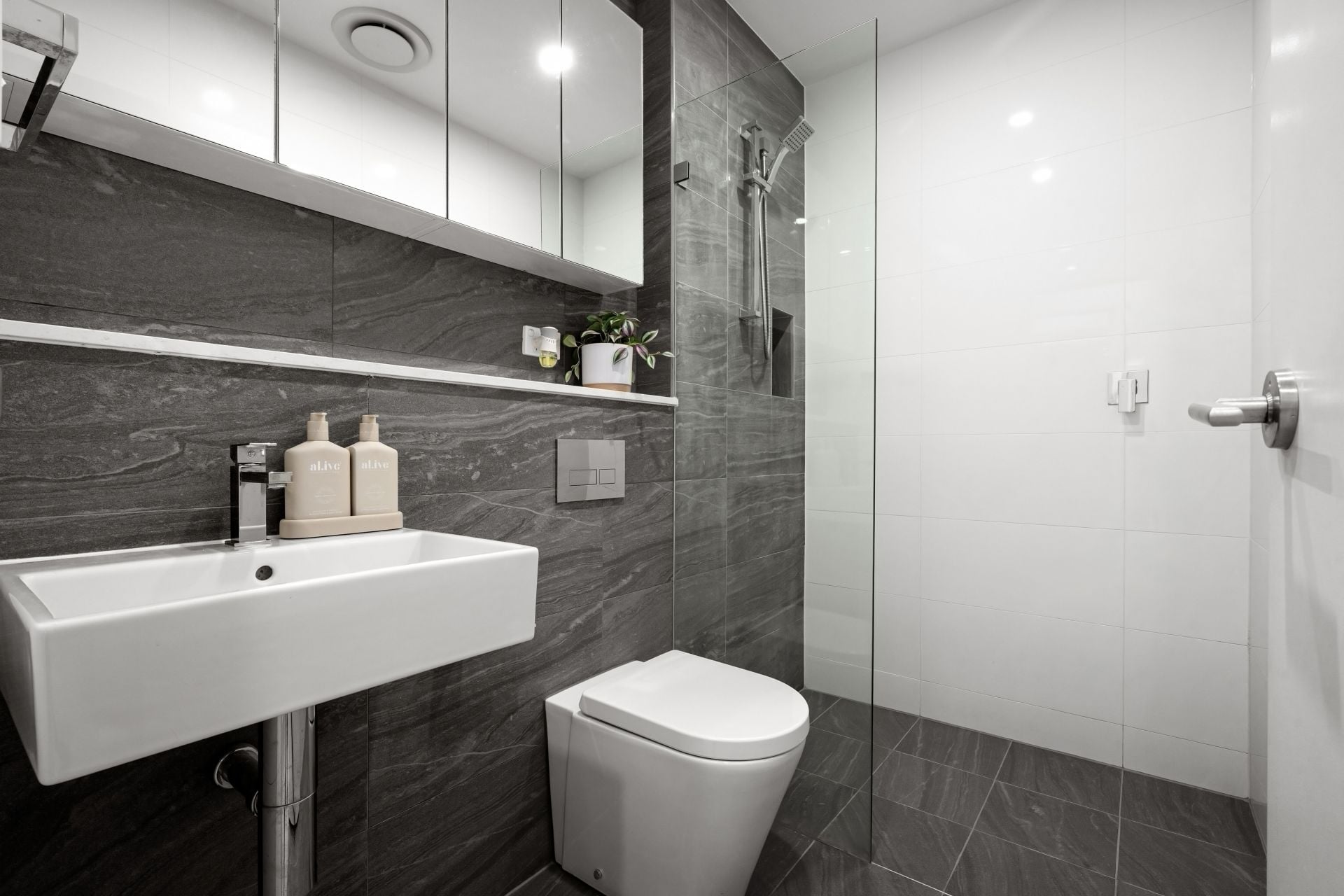 - Sleek contemporary bathrooms and a compact European laundry with a sink, room for both a washer and dryer side by side and plenty of storage