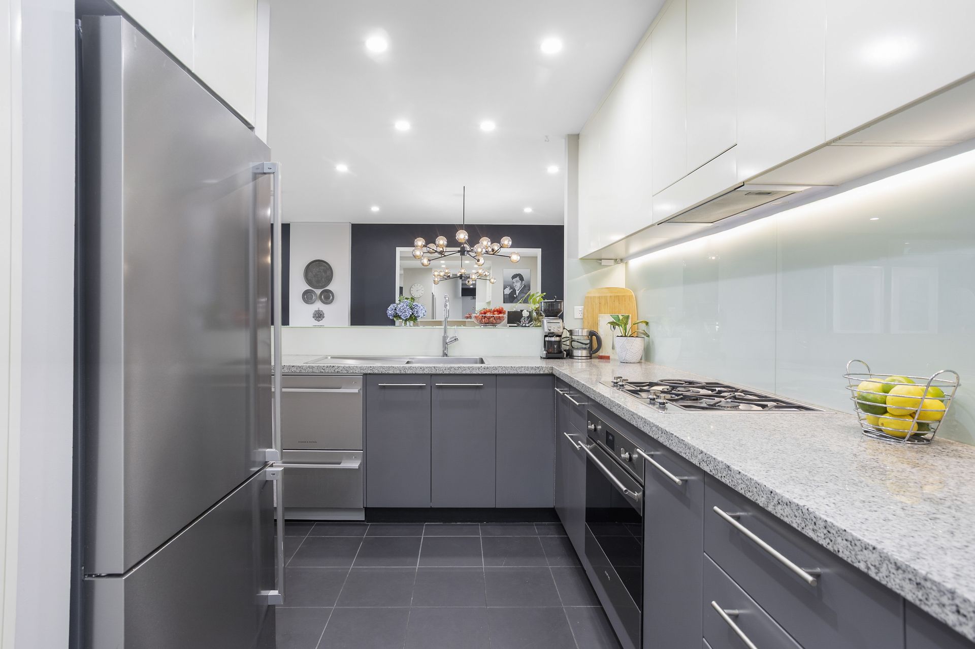 - Modern kitchen with stone bench tops, Smeg cook top, oven, and dishwasher with an abundance of cupboard space