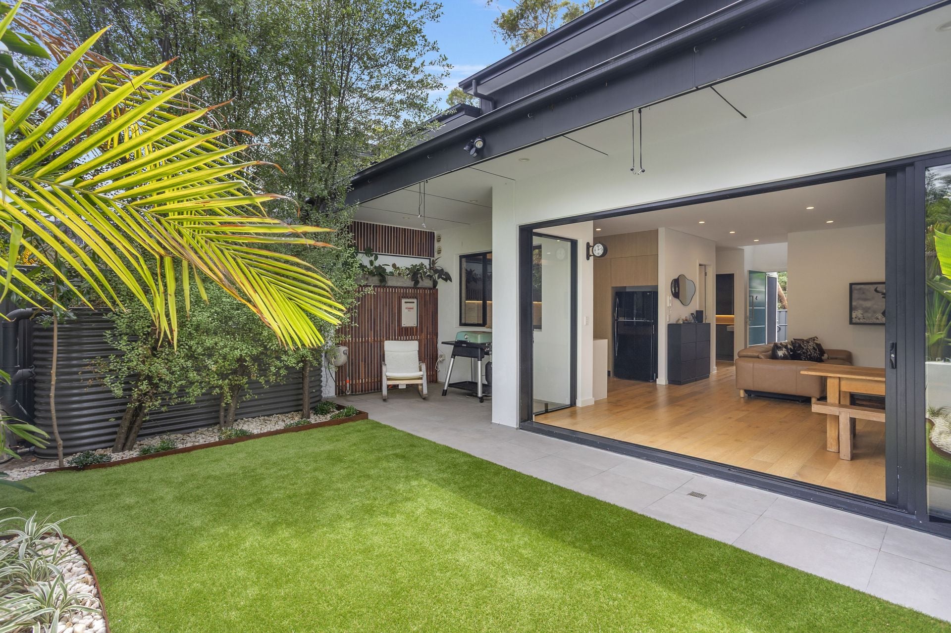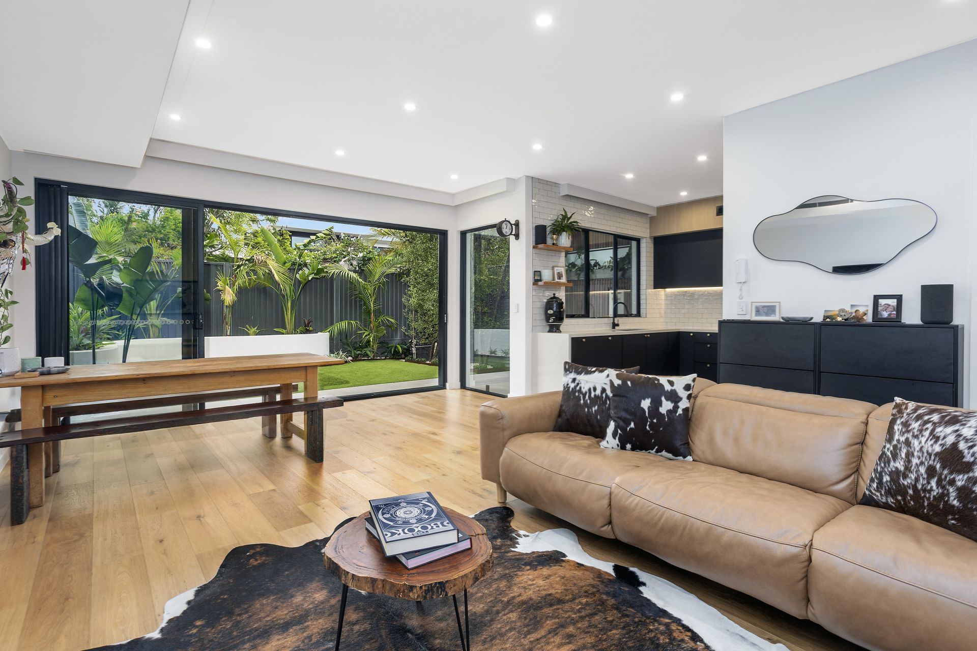 - Light-filled open-plan kitchen, living and dining area with engineered oak flooring throughout and expansive stackable doors opening to a private, leafy courtyard