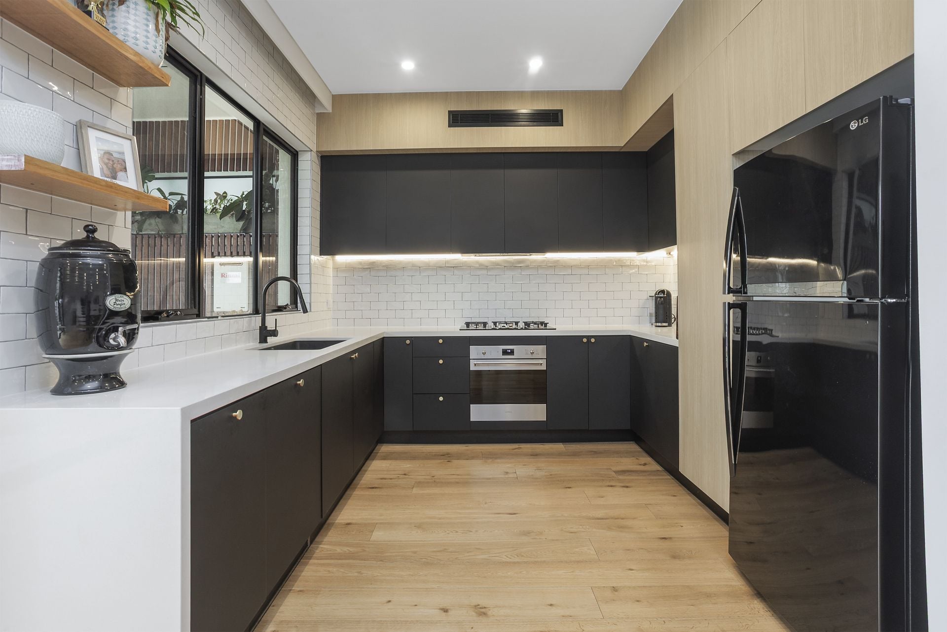 - Contemporary kitchen with SMEG appliances, gas cooking, stone benchtops, matte black and designer cabinetry complimented by a subway tile splash-back