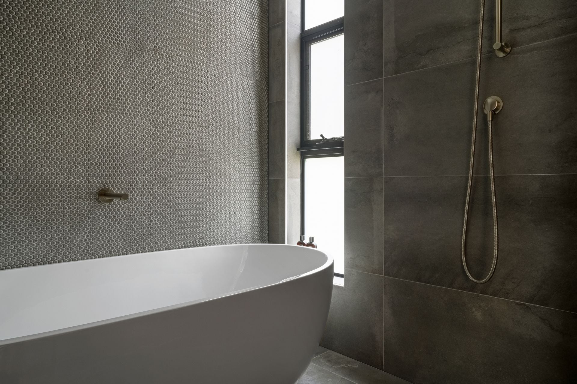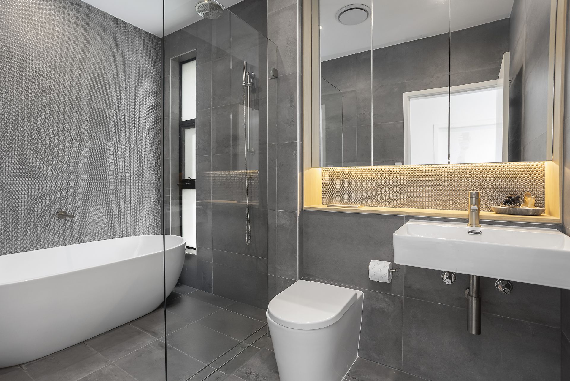 - Main bathroom featuring a freestanding bath, rain head and handheld shower, in-wall cistern, vanity storage, feature penny round tiling and strip lighting